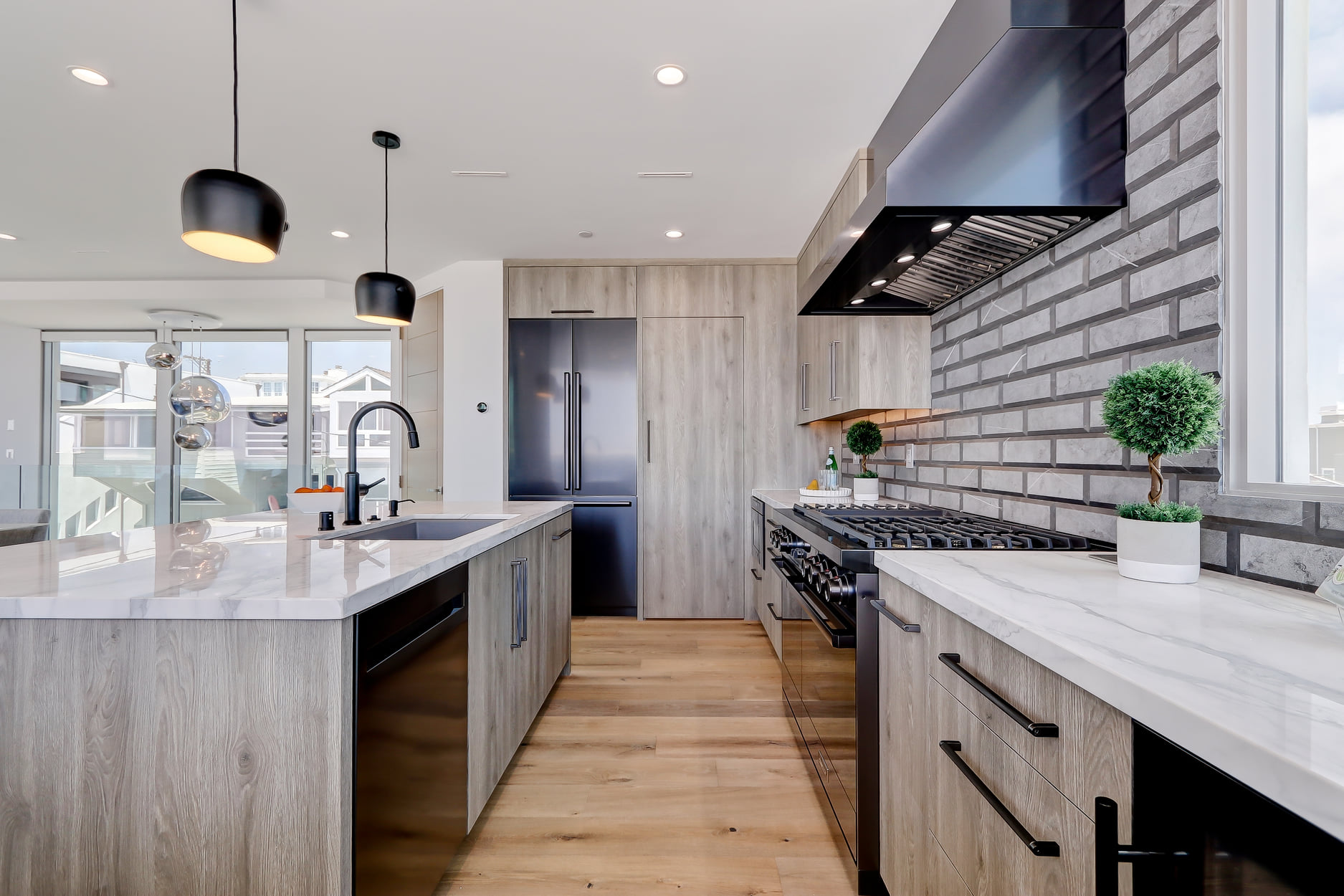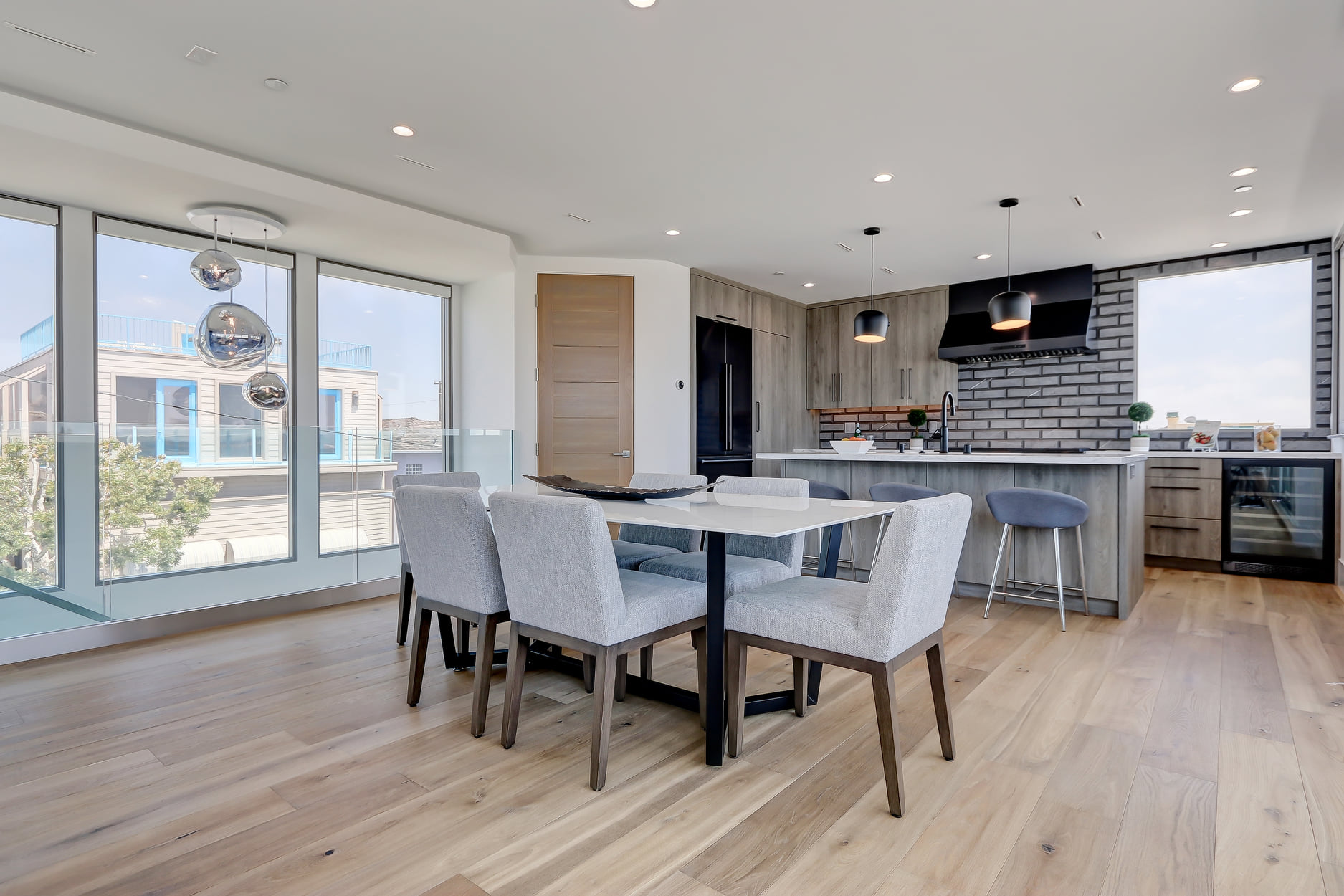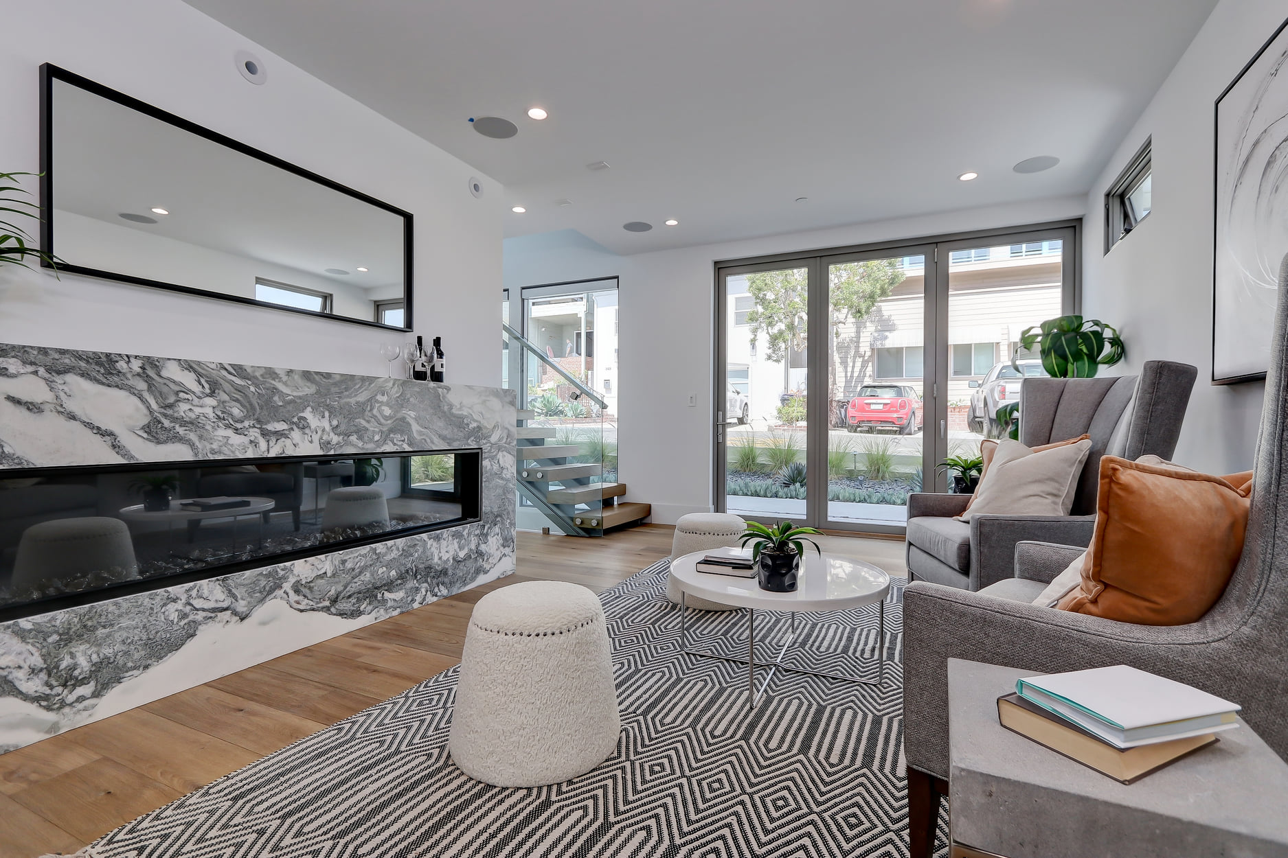 The kitchen is magnificent, with Dacor smart appliances (in sapphire), calacatta marble countertops (including the center island), a unique natural stone marble backsplash, custom cabinetry, Franke sink and walk-in pantry. The powder room sports a marble sink countertop and beautiful etched marble walls. There is a linear 60″ radiant fireplace with calacatta marble surround and a Tom Dixon chandelier over the dramatic floating staircase with glass railing.