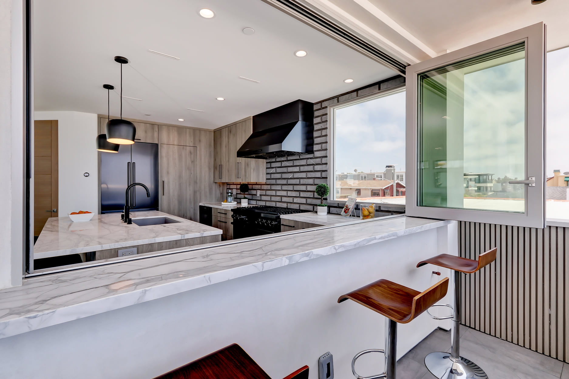 A bonus feature is the covered outdoor balcony that runs the full length of the west side of the home with 4 recessed heaters and a dining bar with a kitchen pass-through, all accessible via 26 feet of multi-slide glass doors. Mid-level are two bedrooms with en suite baths, including the master suite with two walk-in closets and a luxurious master bath with oversized Hydrosystems soaking tub and separate shower with soapstone accents and a frameless enclosure.